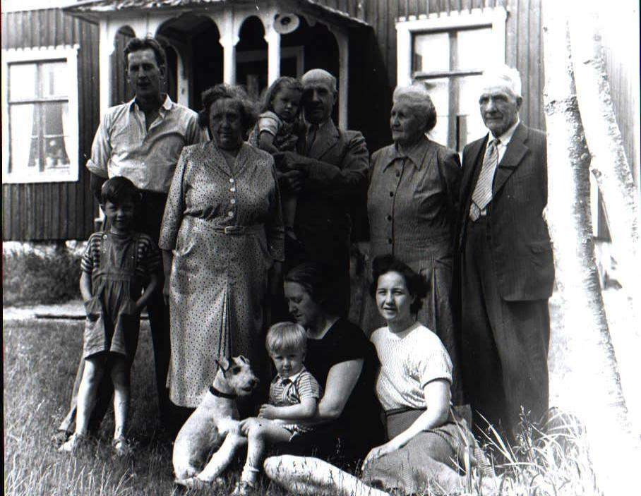 This is a picture from the summer of 1952, in front of our house in Sörbyn. The people are from left to right standing: Fred (about to be 6 year that summer) in front of his father Bengt (Egons only living son), Egons sister Lydia (visiting from Stockholm), Marie (being 2 years that july) in her grandfather Egons´ arms, Egons sister Antonia and her husband Elias. Sitting down in the grass are Nancy with a little boy ( I don´t remember his name but he was not Nancy´s son) in her arms and Fred´s and Marie´s mother Sonja.