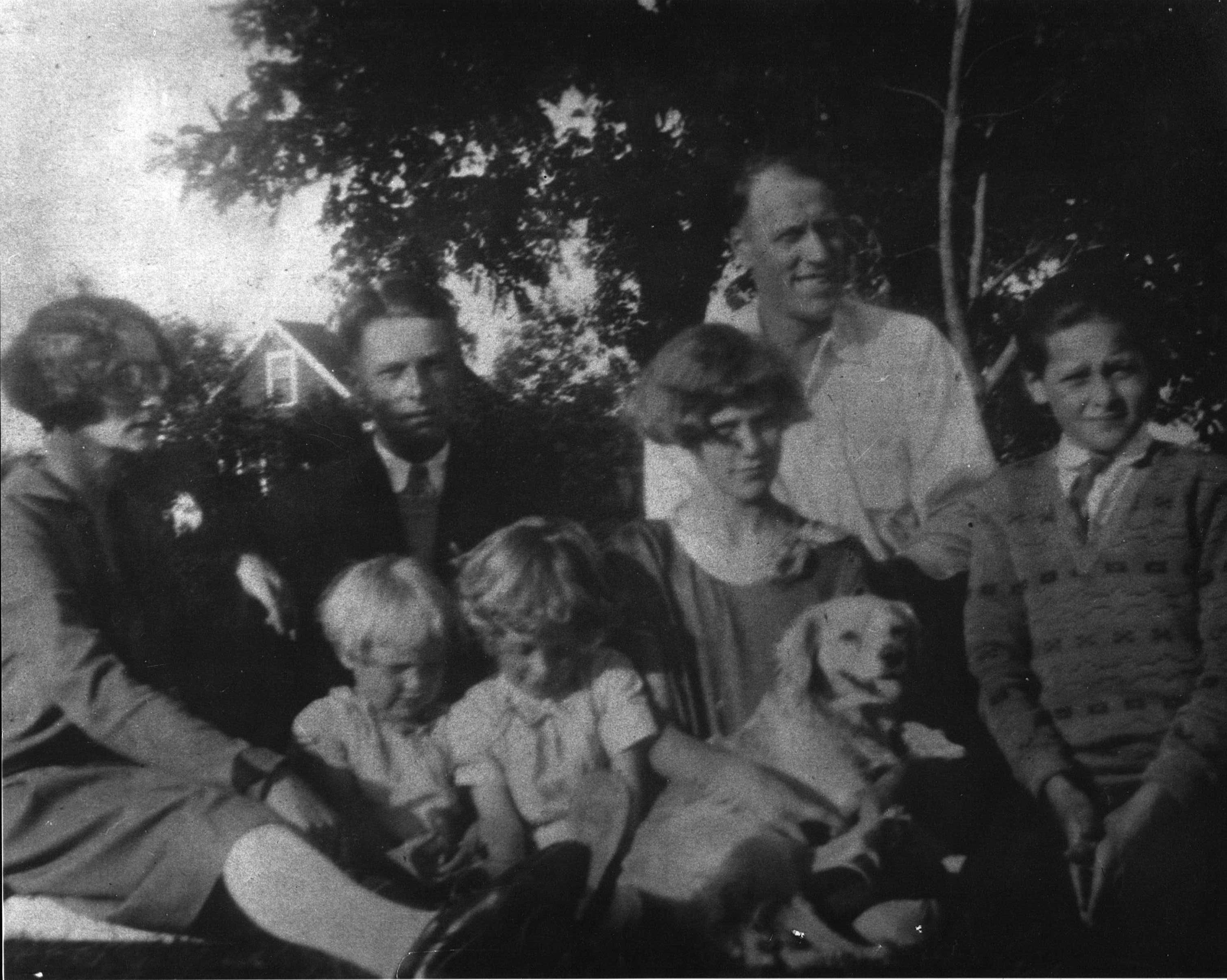 From the left - back row, Aldena, Dana, John Everett, Robert Everett - front row Glennis Ethel, Norma Helene, Ruth Elaine holding Dixie, the cocker spaniel. Picture probably taken in 1928.