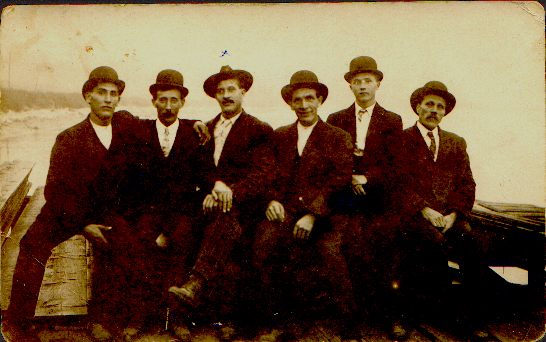 Loggers at Widhbey island near Seattle. This picture set me off into genealogy asking myself "Who is my cousin Axel"? on this picture from Egonīs album. Axel far right and Egon marked by x.